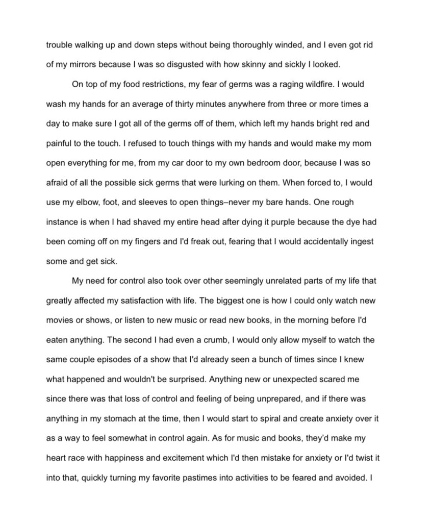 - She spent hours obsessively logging what she ate, checking expiration dates, scrubbing her hands raw, and reviewing her “safe” intake
