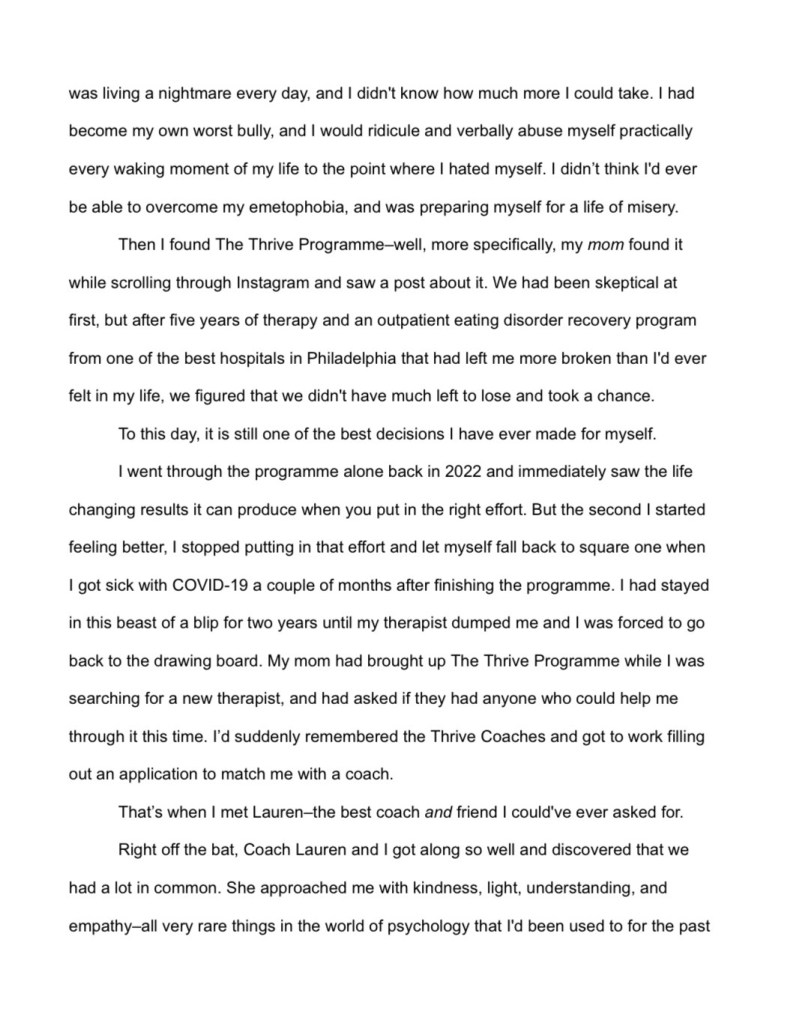 “I’ve had emetophobia since I was 6 years old and I’d suffered with it for 16 years until I found the Thrive programme and Coach Lauren. The first time I did the programme, I’d gone through it on my own, without a coach, and was doing good and steadily taking back control of my life until I got COVID 3 months after finishing reading the manual. I had completely let myself backslide and go back to my old, harmful ways and rituals that left me feeling powerless, out of control, and overall miserable. I was barely surviving each day, both mentally and physically, let alone thriving.