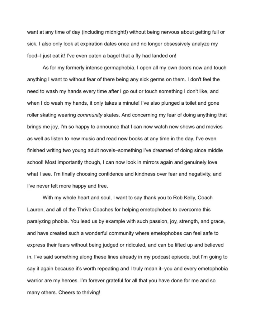 She also had interests similar to mine and had even gone out of her way to read some of my published writing that I had mentioned to her. Right away, Coach Lauren had made me feel cared for and seen, and for the first time in 2 years, I felt confident that I was going to overcome my emetophobia and take my life back and start enjoying living again. And I was more than right.
